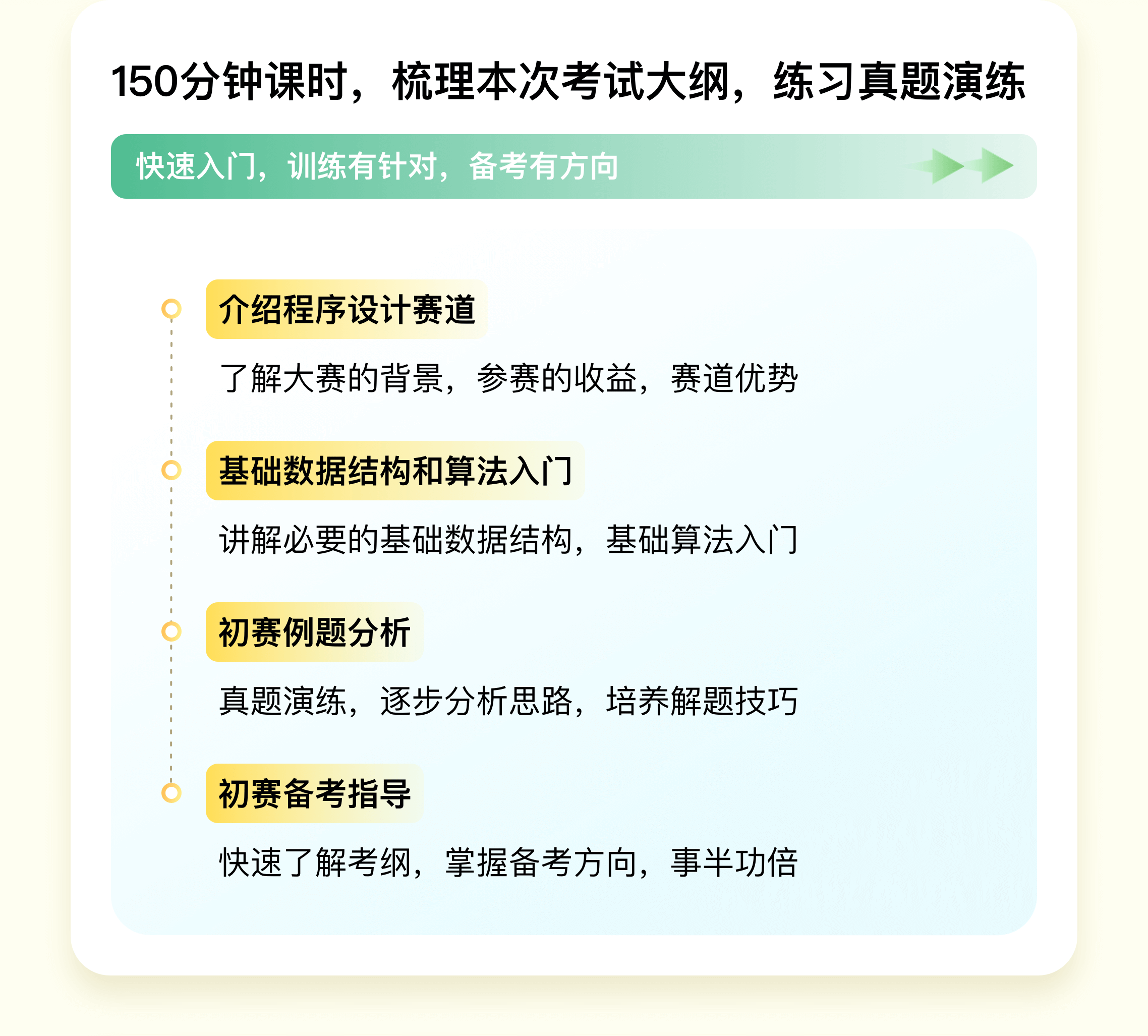 本课程详细介绍了参加传智杯大赛能带来哪些收益,重点介绍了程序设计赛道相关内容,详细讲解了算法相关基础知识,为参加大赛打下坚实的基础。